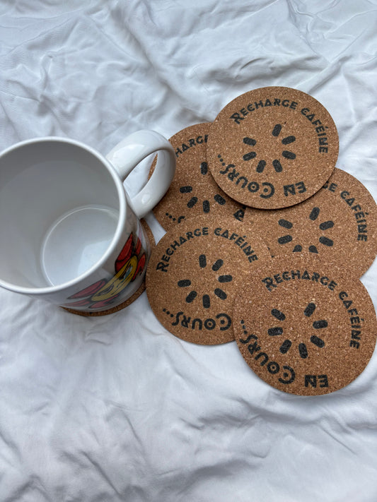 DESSOUS DE VERRE EN LIÈGE « RECHARGE CAFÉINE EN COURS… »